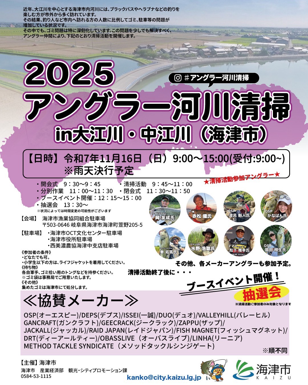 11月16日、岐阜県海津市にて行われる「2025アングラー清掃活動in大江川・中江川(海津市)にブース出展いたします。