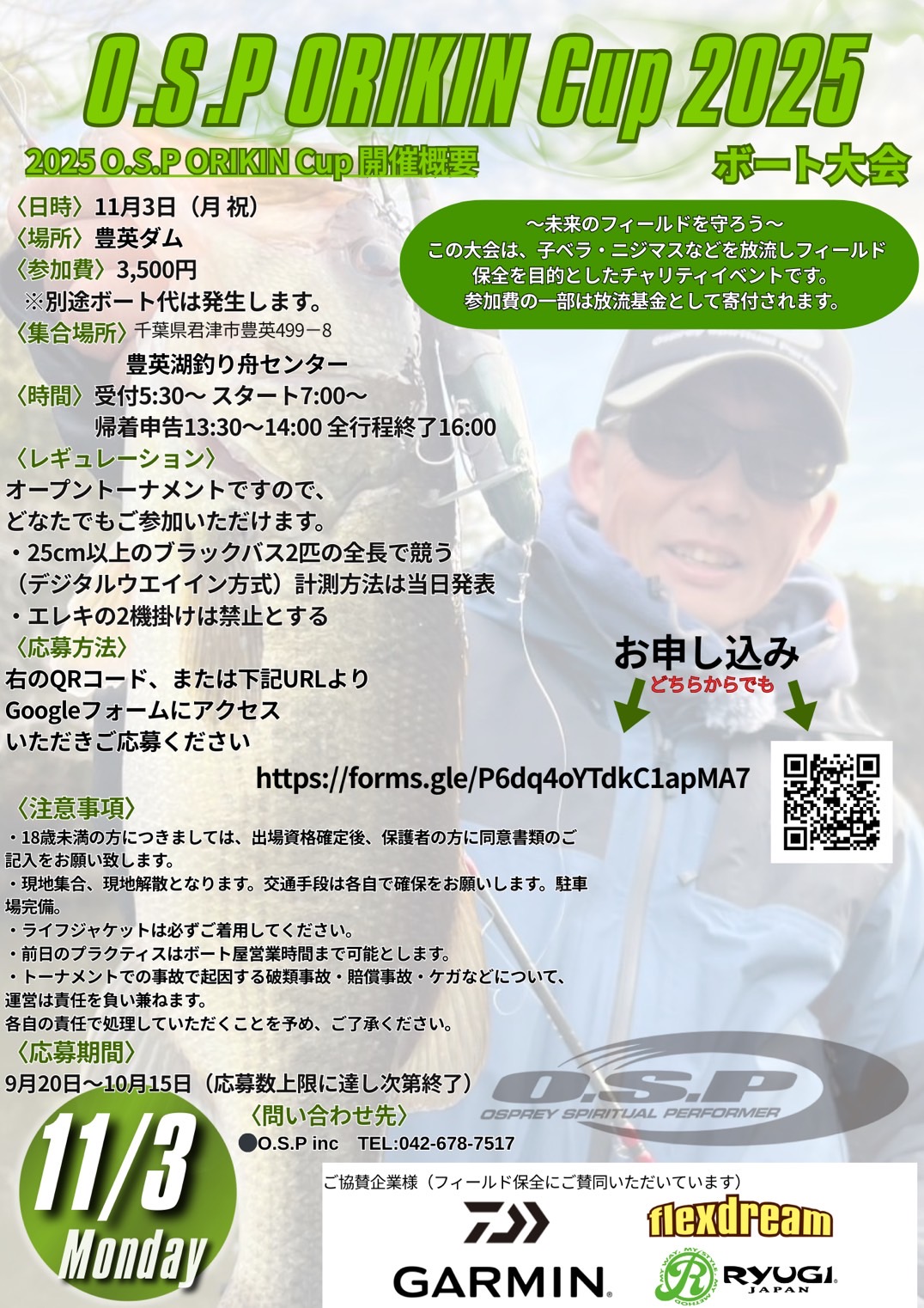 この度、2025年11月3日(月)千葉県豊英ダムにて「O.S.PオリキンCUP2025」を開催致します。