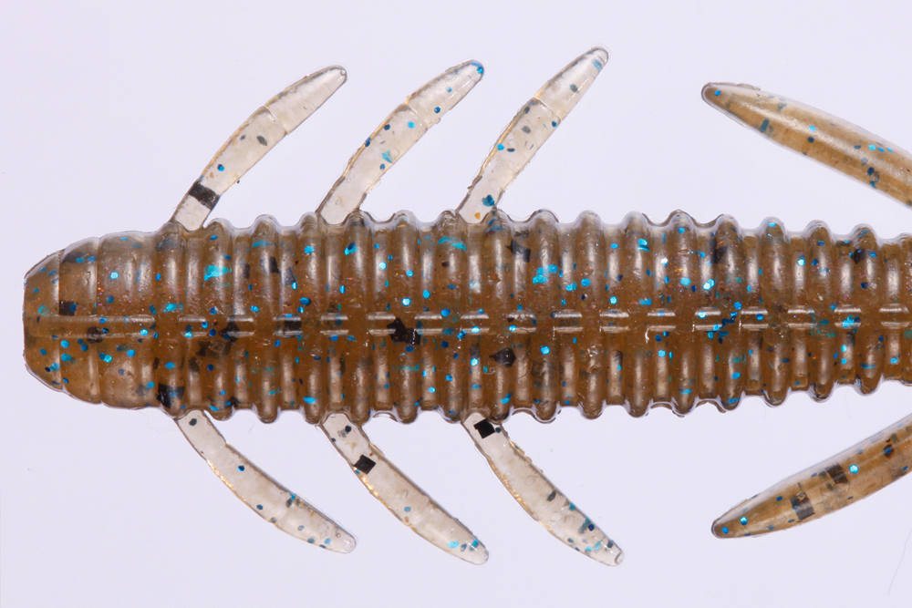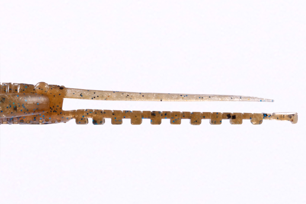 ヒゲとフラットテールの2段配置ヒゲとフラットテールを横一列に配置するのではなく、縦列に、それも間隔を空けて配置。これにより、見た目のボリューム感は細身ながら双方のパーツが同時に異なる動きを発する、極上の喰わせアクションを生み出す。
