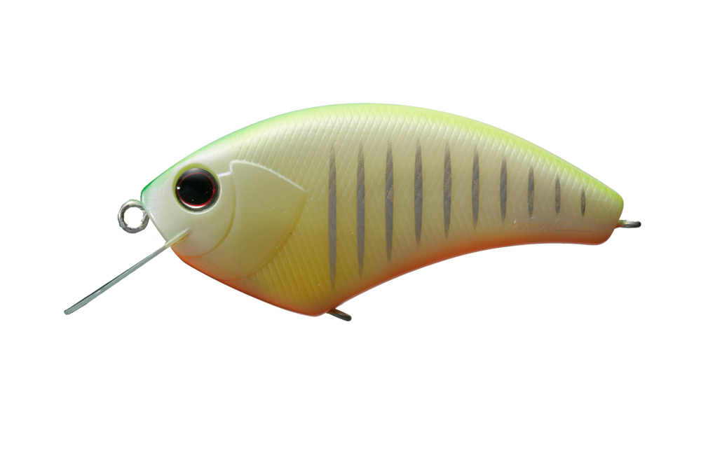 ウッド製の最大の弱点といえるキャスタビリティの悪さを大型タングステンによる重心移動システムで解消。さらに、U字型の固定ウエイトに移動ウエイトボールがすっぽり収まるホールインワンシステム(PAT.)によって重心移動式でありながらウッド同様の一点集中重心の泳ぎを手に入れた。また、リップの角度とウエイトの位置、フックの取り付け位置を考慮し前傾姿勢を強めることによって、レベルを超えたスナッグレス性能を実現。さらに、ABS樹脂の強度を保ちつつ40%の肉薄化に成功したハニカムスーパーHPボディによって、ウッド製フラットサイドのアベレージを完全に上回る浮きスピードをマークした。また、軽量極薄HPスラッシュビルとの相乗効果でウッド製を上回る超ハイピッチなレスポンスをムラなく実現した結果、実釣においてもこれまでに経験したことのない「寄せる力」を見せ付ける。例えばテトラの際などを平行に通しただけで、通常のラウンドクランクでは出て来ない、中にひそむバスが猛然とバイトしてくることも珍しくない。さらに、多少コースがずれてもかまわずバイトしてくるほどだ。
