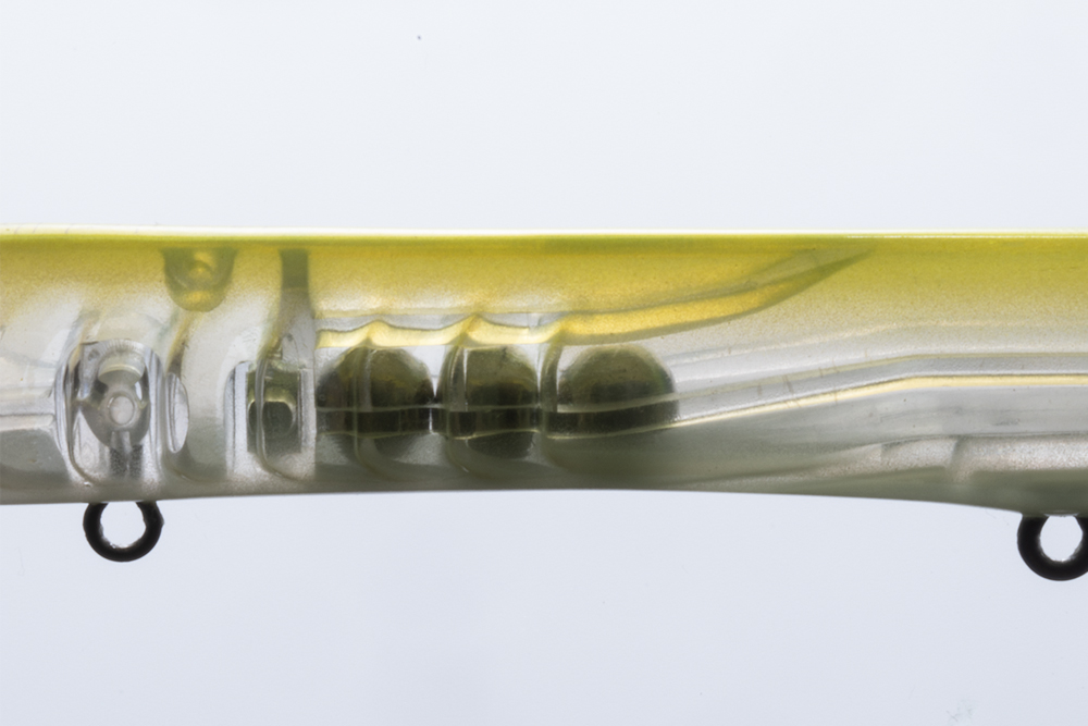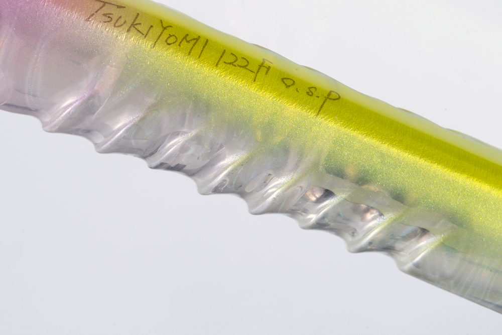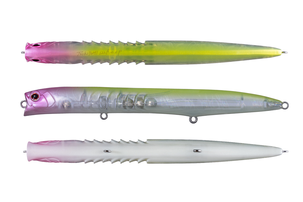 細身のシルエットで弱波動のルアーはどうしてもノー感じになりがちである。その欠点を克服するべく、デザインと設計を徹底追及。月夜巳はアングラー自身がしっかりとした操作感を得られて、使いやすく釣れるというトータル性能を向上させたフローティングミノーである。口元の水受け面と側面の表面積を増やしたサイドジャギーの両方が水流を受けることで、弱波動アクションはそのままに巻き感をアップ。細身で抵抗の少ないルアーでは得難い水中の情報を明確にキャッチし、流速の変化にいち早く対応することを可能とした。デッドスローでは頭から尻尾にかけてボディ全体で引き波を立ててI字で泳ぎ、流れを受けると、徐々にサイドジャギーから尻尾へと引き波を出す位置を変えながら、ふらつきロールアクションへと変化していく。安定した水平姿勢、かつ弱々しいアクションはセレクティブなシーバスにも口を使わせる。