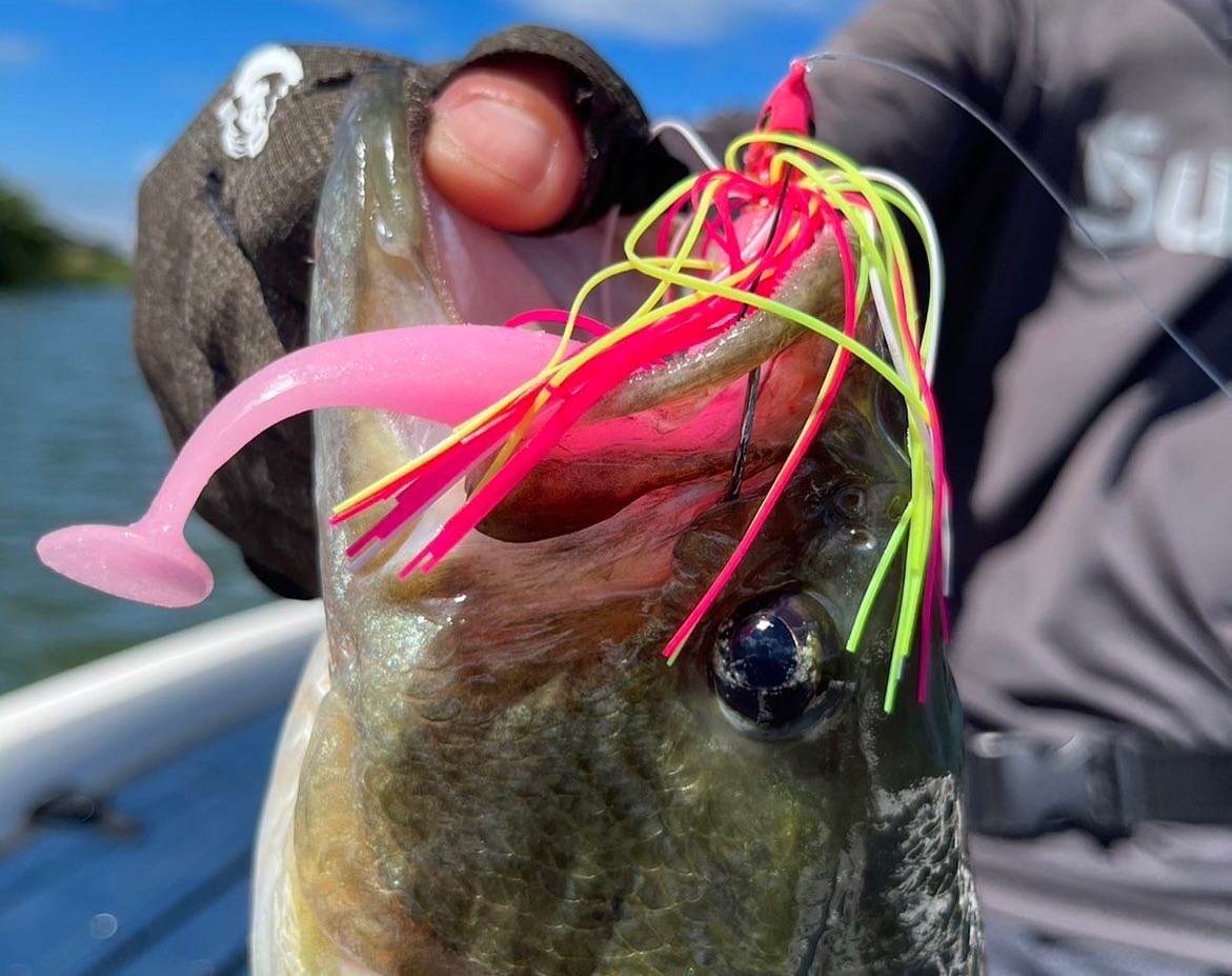 スリッパー+ドライブシャッドを使用したスイムジグの釣りです。