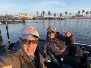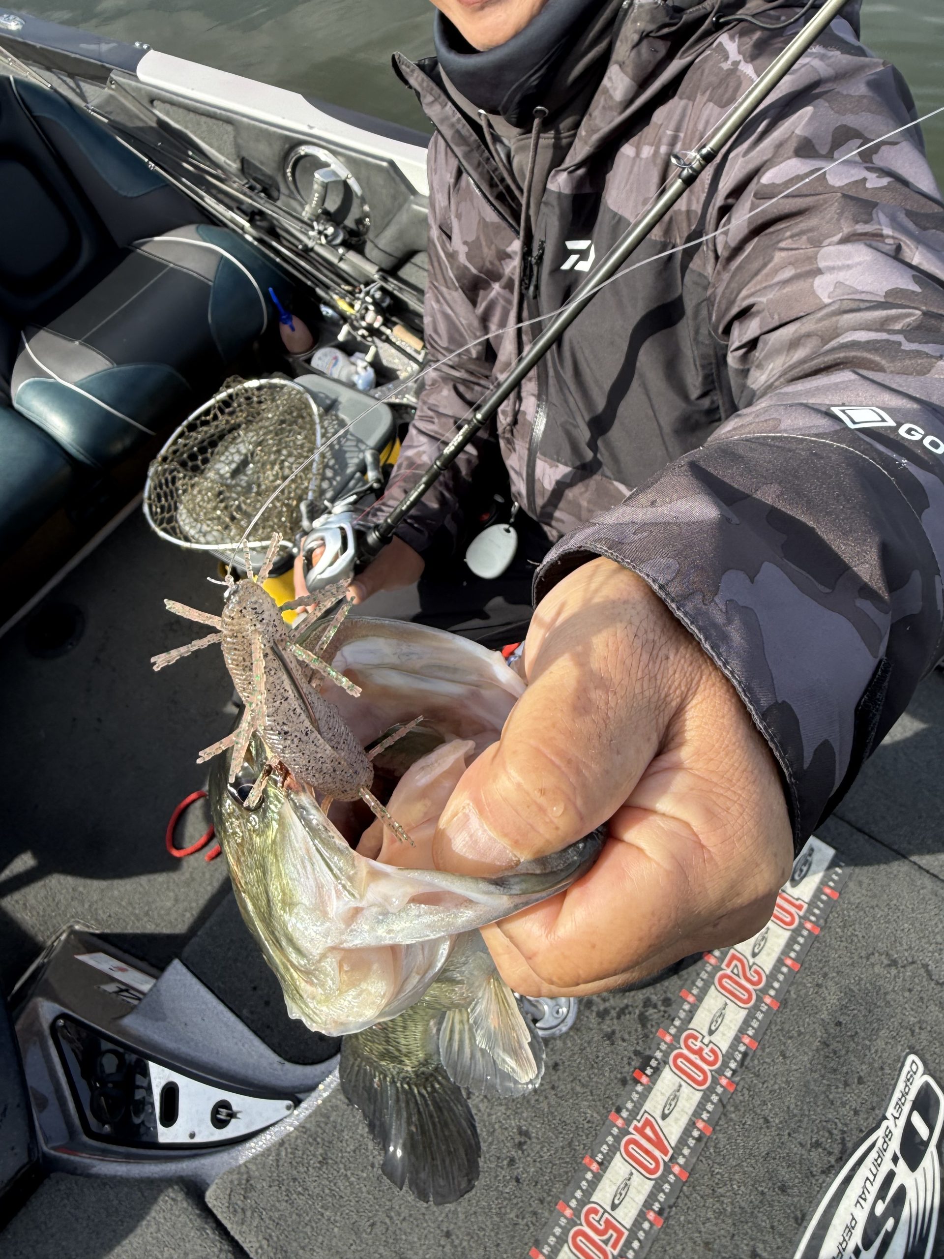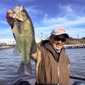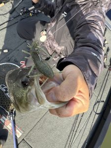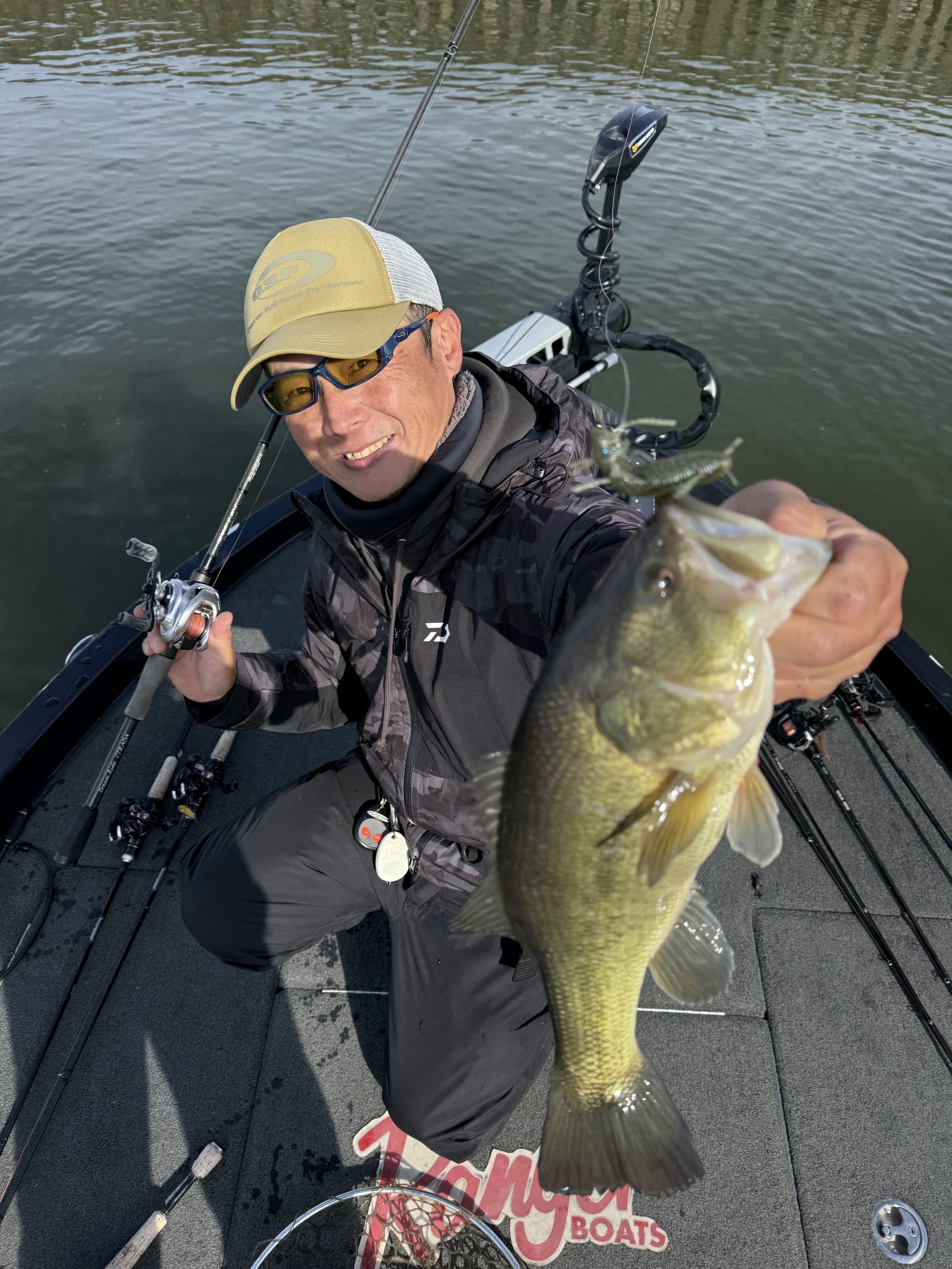 僕から「低水温時はバイトが浅いからバイトがあったらライン少しを張ってあげるとバスが獲物を逃がすまいとルアーをしっかり食い込むよ」とワンポイントアドバイス