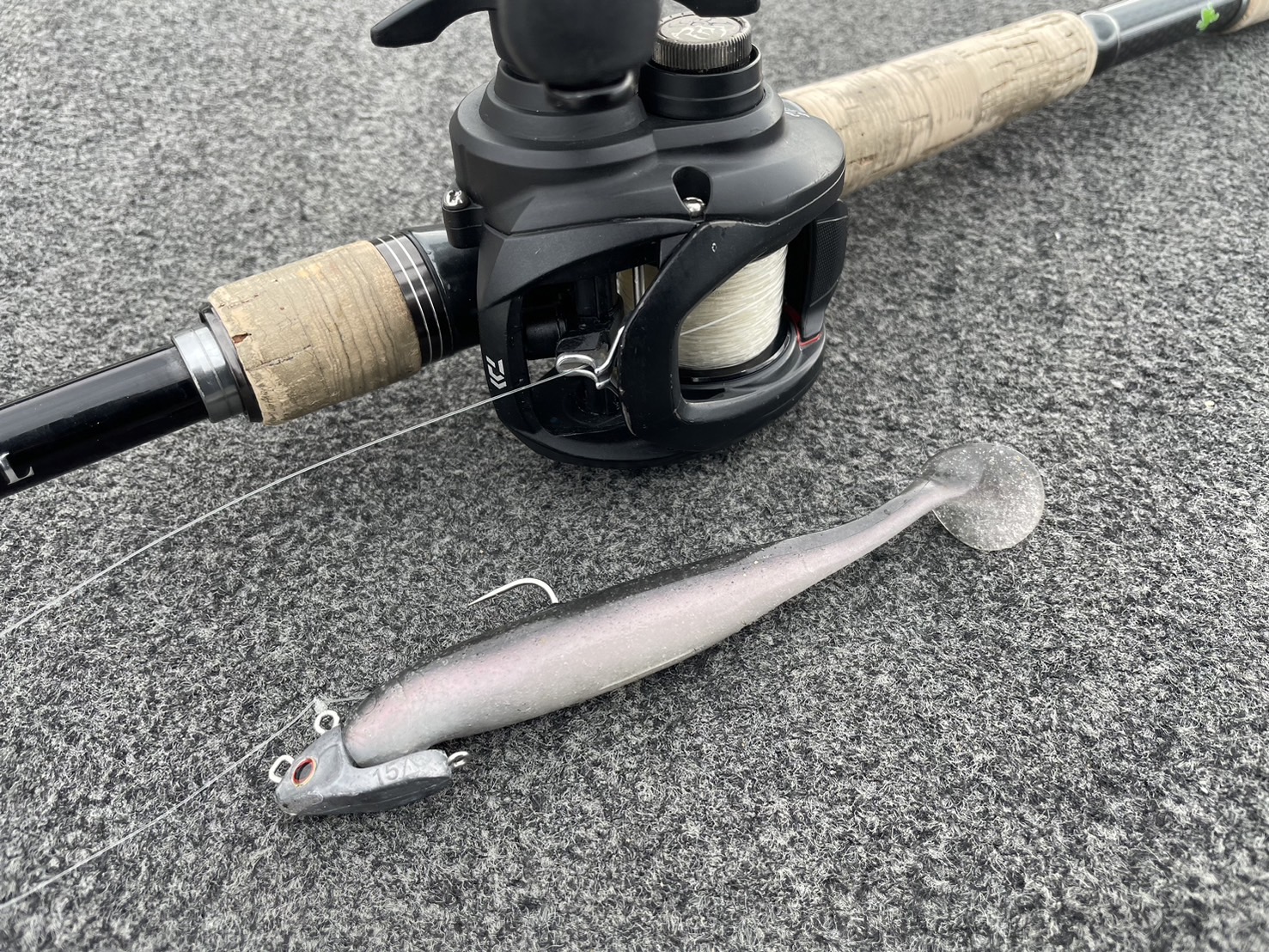 そしてスピナーベイトでは強すぎるようなクリアな水質、微風などのタフコンディションで機能するのが、北湖定番のジグヘッドタイプのスイムジグです。