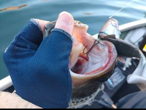 使用するPEは2号位で十分でしょう。このセッティングでほかのルアーでも2㎏以上の魚を何匹も釣っていますが、一度もPE部分が切られた事はありません。不安であれば結び目に瞬間接着剤を付けてみてください。ちなみに写真の魚はPE1.5号でした。フリーノットのリングのサイズによって背針の位置も変えれますので、大き目のフックを使いたいときは小さめのリング、ショートバイトを掛けに行きたい時は大き目のリングにしてよりテール側にフックを挟むなどお好みのセッティングができます。